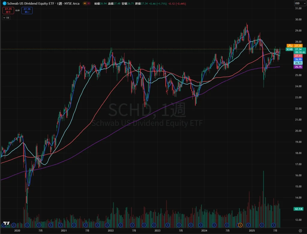 2025年8月14日時点でのSCHDの終値は27.34 USD(−0.44%)でした。